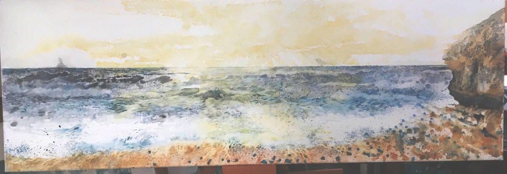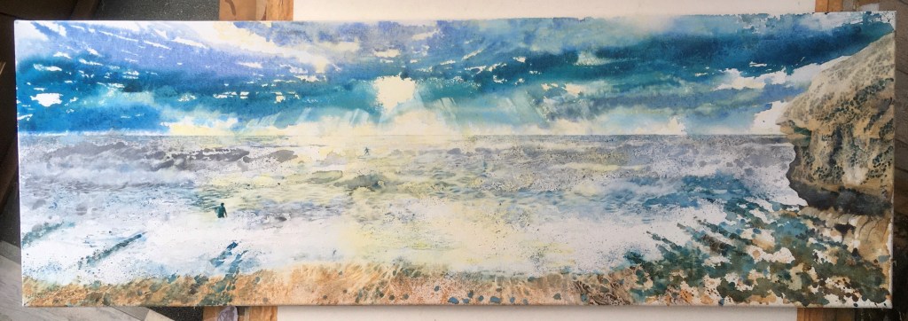 Here’s my first blog on the new web-site. These extraordinary times have given me the opportunity to get back into the studio after a long absence. Lots of paintings which have been half-planned or just in my head are starting to take shape. The ‘View From Salthouse Cliffs’ was completed recently and I suspect will be painted many many times in one form or another because the light there is never the same from one day or one hour to another. Next up will be another watercolour on canvas so I can make use of the wide format and easy-lifting characteristics. I want to explore a late evening view of the surfers and the weird rock formations at the north end of Salthouse beach. I love to surf, but those guys have nerves of steel….I know what the rocks are like just underneath them!!